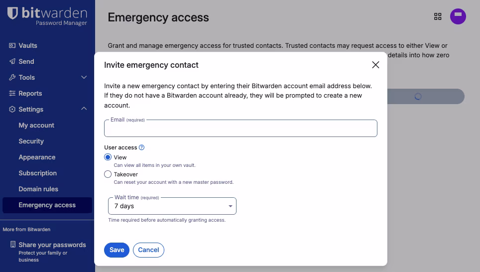 紧急访问允许您指定和管理可信任的紧急联系人，他们可以在紧急情况下请求访问您的密码库。您可以授予联系人查看或接管用户权限，从而控制他们在需要介入时可以执行的操作：