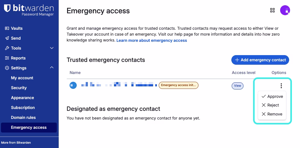 您可能需要撤销已信任的联系人对您的密码库的访问权限。移除某人先前被授予的对您帐户的紧急访问权限的步骤取决于此用户是被授予查看访问权限还是接管访问权限。