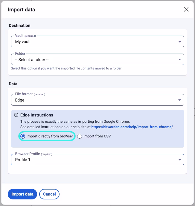 <div align="left" data-with-frame="true"><figure><img src="https://bitwarden.com/assets/1dZKYVPQpd1TVDcmUuwLq2/23e9b222768964108ade8c02e52134ee/Directly_import_with_Chromium.png?w=652&#x26;fm=avif" alt=""><figcaption><p>直接从浏览器导入</p></figcaption></figure></div>