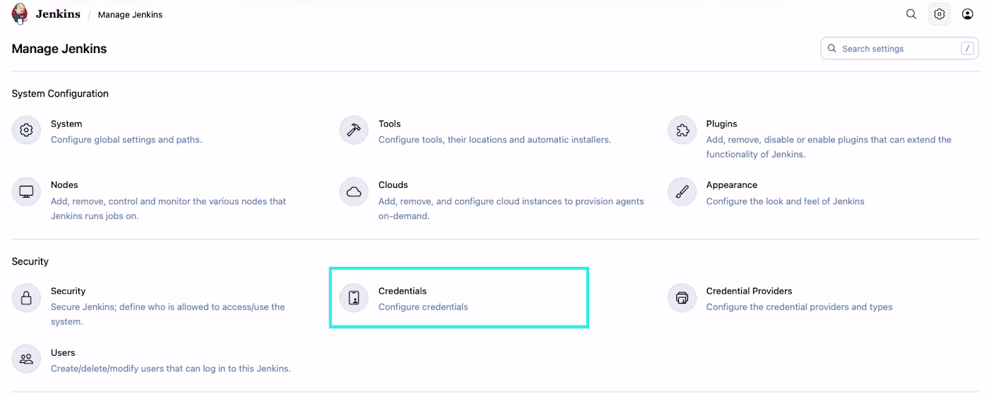 1、在 Jenkins 中，导航至 **Settings  → Credentials** 页面。